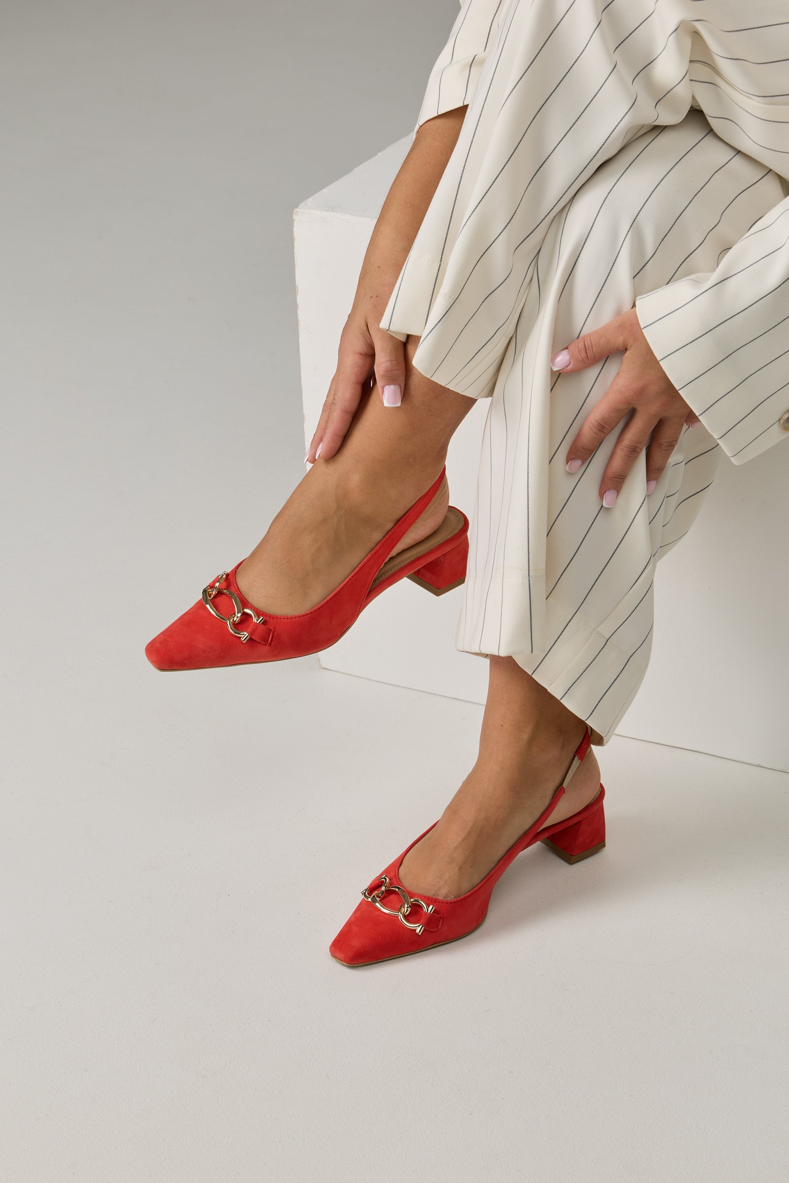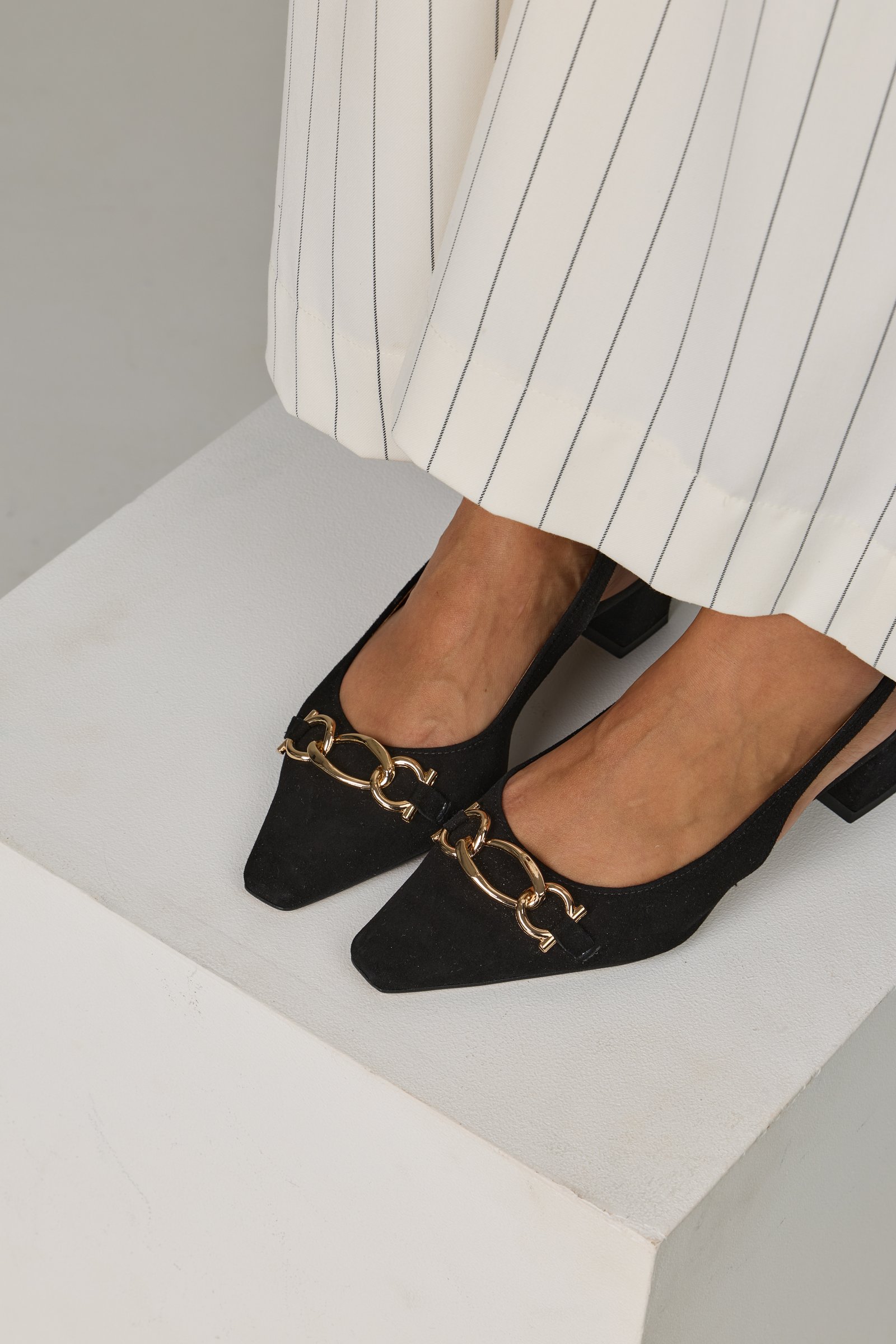329,00 złEleganckie czółenka bez pięty wykonane ręcznie z naturalnej skóry zamszowej. Model wyróżnia się klasycznym, smukłym noskiem oraz subtelną złotą ozdobą na przodzie buta. Niski, stabilny obcas zapewnia wygodę podczas codziennego użytkowania, a skórzana wkładka zwiększa komfort noszenia.